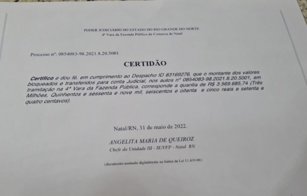 O Governo do Rio Grande do Norte recuperou via decisão judicial R$ 3.569.685,74 dos R$ 4.9 milhões pagos pelos respiradores via Consórcio Nordeste que não