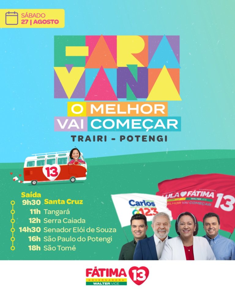 Governadora e candidata à reeleição Fátima Bezerra (PT) estará neste Sábado (25) em Santa Cruz, Fátima iniciará a “Caravana o melhor vai começar ” que percorrerá as regiões Trairi e Potengi, o início da caravana se dará a partir das 09h30 em Santa Cruz, saindo em seguida para Tangará, Serra Caiada, Senador Elói de Souza, São Paulo do Potengi e São Tomé, será a primeira vez nesta campanha que Fátima virá a Santa Cruz.